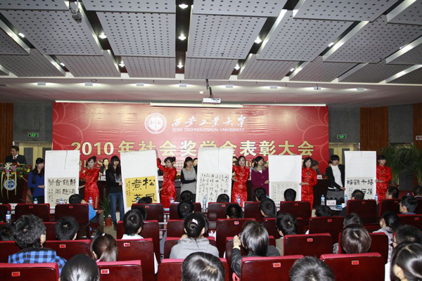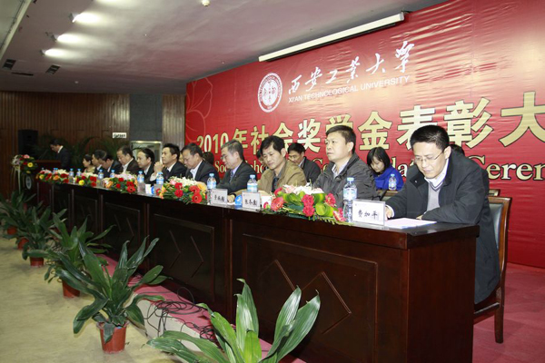 (本网讯)11月5日,西安工大2010年社会奖学金表彰大会在未央校区隆重举行。校党委书记赛云秀,副校长张君安、刘卫国、陈桦,纪委书记许尚年出席大会。中国兵器工业西北兵工局局长张世安,中国兵器工业集团第202研究所副所长许耀峰,中国兵器工业集团第203研究所党委书记刘海虹、副所长曹庆申,中国兵器工业集团第204研究所副所长景振禹,北方光电科技集团公司(原205所)党委副书记宋力力,北方电子科技集团公司(原206所)总经理刘中会,中国兵器工业集团第212研究所党委书记吴英洪、副所长李浛沛,美国密苏里科技大学教授田正仁,西安全星智能公司董事长王林祥,中国核工业中原建设公司西安分公司总经理张冬至,西安燎原液压有限责任公司副总经理费加平以及各设奖单位人力资源部负责人等应邀出席了大会。参加大会的还有西安工大党办校办、学生工作部、研究生部、国际交流与对外合作处等部门负责人,以及各院系有关领导、辅导员和获奖学生代表等。