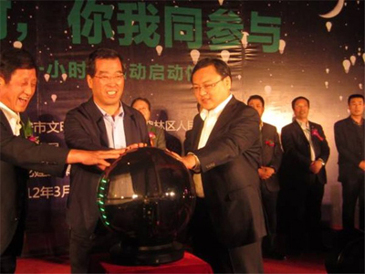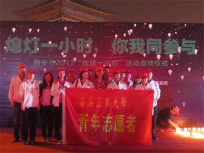 "地球一小时"是世界自然基金会的一项倡议,希望人们在每年3月的最后一个周六8时30分到9时30分熄灯并关闭电器,以此激发人们对保护地球的责任感。我校志愿者通过向过往路人发放宣传单、介绍“熄灯一小时”的含义,大力宣传环保知识。晚8:30-9:30,西安钟楼邮局、开元商城、钟楼饭店以及周边的银行大厦户外玻璃幕墙、大堂及大部分办公楼层等区域的电源集中关闭一小时。 我校学生公寓部分学生宿舍也举行了熄灯一小时活动。