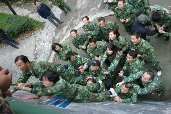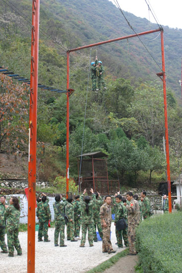 在校长刘江南、党委副书记丁养斌的带领下,大家身着迷彩,精神百倍地参与了户内和户外拓展培训。出色完成了高空断桥、独木桥、高空绳索、信任背摔、绝壁求生等科目,展现出了良好的心理素质和团队精神。相信本次培训的成果,会在今后的工作中更好地体现出来。