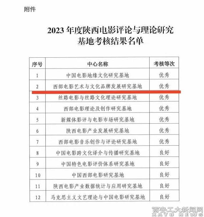 (本网讯)近日,中共陕西省委宣传部正式公布了2023年度陕西电影评论与理论研究基地考核结果,我校“西部电影艺术与文化品牌发展研究基地”以排名第二的优异成绩获评“优秀”等级。