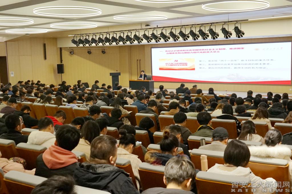 (本网讯)11月28日下午,西安工大举行党的十九届四中全会精神辅导报告会,校党委书记刘卫国主讲。会议由校党委副书记、校长雷亚萍主持。