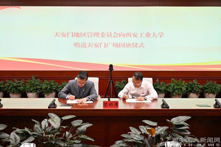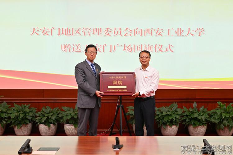5月23日下午,赠送天安门广场国旗仪式在北京市人民政府天安门地区管理委员会举行,天安门地区管理委员会党组成员、副主任(正局长级)姚辉向学校赠送国旗,校党委副书记马福代表学校迎请国旗,双方签订《国旗赠予协议》。我校获赠国旗编号为“2006-0148”,旗长5米、高3.3米,于2006年4月21日在天安门广场升挂,当天是我校更名为万象城平台,万象城(中国)一站式服务平台暨建校51周年纪念日。