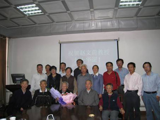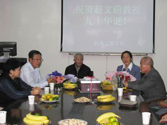 庆寿会上,机电学院青年教师代表向赵文蔚教授献上鲜花,表达心中的敬仰和尊重;学生代表献上了鲜花和生日蛋糕,表达了全体学生的祝贺之情;老教师们用诗、对联表达对赵教授90华诞的祝福;赵教授的同事、学生,回顾了往昔他在研究教学、关心同事工作学习生活的趣事。青年教师感悟赵教授献身教育事业、致力教书育人的崇高精神,表示要学习他治学严谨、大爱无疆的为人处世风范。生日庆祝形式简朴而温馨,气氛喜庆而热烈,学术气息十足。