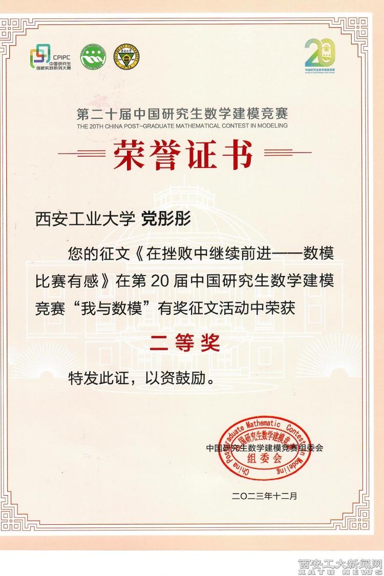 (本网讯)继我校研究生在第二十届中国研究生数学建模竞赛中荣获17项(一等奖2项、二等奖8项、三等奖7项)国家奖后,我校研究生积极参加了研究生数学建模竞赛组委会举办的“廿载数模情 砥砺向前行”之“我与数模”征文活动,基础学院数学系研究生党彤彤的作品《在挫败中继续前进——数模比赛有感》荣获全国二等奖,位列全省高校第2。
