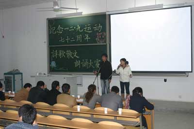 最终来自人文学院的李俊、王莉莎同学的《在这个清晨缅怀》获得一等奖,郭尚昆同学的《为我中华喝彩》和高明明同学的《血铸中华》获得二等奖,徐强、任斐羽、谭道慧获三等奖。