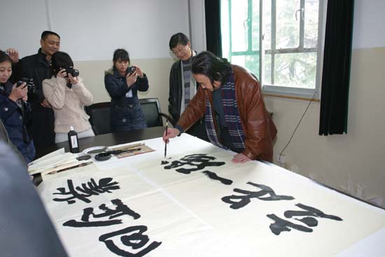 雷珍民先生在讲话中充分肯定了我校在“书法进校园”活动中的表率作用。他希望能再接再厉,把中国传统发扬光大,真正做到“书光普照”。张山先生在讲话中叙述了自己和西安工大的深厚友谊,并希望全体师生都能够传承和光大中国传统文化中的人文精神。于唯德院长表示了对学校领导、书法界领导以及艺术学院诸位教师的感谢。最后,刘江南校长讲话强调要加强国学和传统文化教育,使学生能够全面发展。