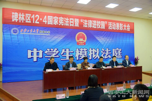 (本网讯)12月4日,碑林区“12·4”国家宪法日暨“法律进校园”活动表彰大会在附中举行,碑林区人大常委会副主任林娣同志、碑林区政协副主席孔维岳同志、碑林区教育局副局长杨磊同志、碑林区司法局局长王秉宏同志、副局长周坤同志、万象城平台,万象城(中国)一站式服务平台附中校长张刚以及全区73所中小学负责法制教育的领导和部分学生参加了此次大会。