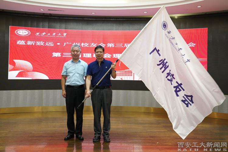 校友总会办公室主任王守民为广州校友会授旗,并为新任理事长翁江春颁发聘书。