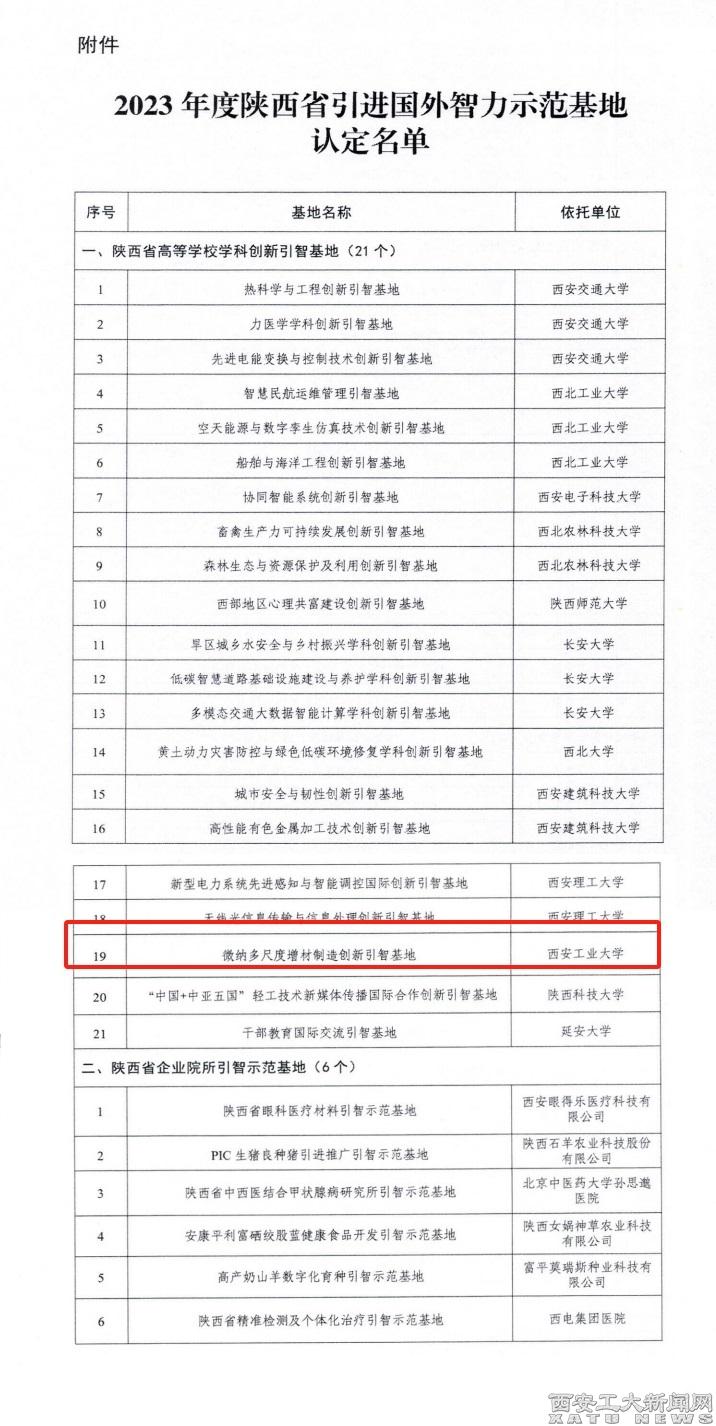 (本网讯)12月29日,陕西省科技厅公布了2023年度省引进国外智力示范基地认定名单,我校材料与化工学院申报的“微纳多尺度增材制造创新引智基地”成功入选陕西省引进国外智力示范基地。此基地的成功获批是我校省级引才引智平台上的重大突破。