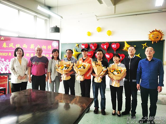 院领导为四位退休教师送上鲜花、荣休纪念品并合影留念。