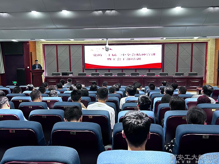 (本网讯)为深入学习贯彻党的二十届三中全会精神和习近平总书记关于工人阶级和工会工作的重要论述,持续增强工会干部的服务能力和水平。10月16日,校工会在未央校区举办了党的二十届三中全会精神宣讲暨工会干部培训。陕西工运学院副院长乔昕教授受邀做专题报告,党委副书记梁云鹤出席、全校工会专兼职干部及基层党委(党总支)书记100余人参加。会议由校工会主席朱峰主持。