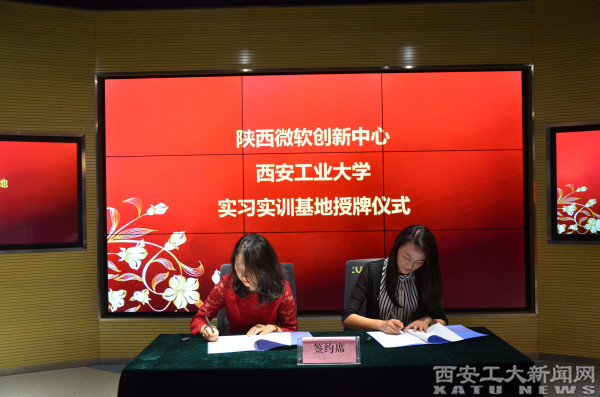 (本网讯)近日,我校与陕西微软创新中心签署“本科学生教学实习基地建设合作协议”。陕西微软创新中心总经理助理吴静璇、我校教务处副处长闫莉为“实习实训基地”揭牌。