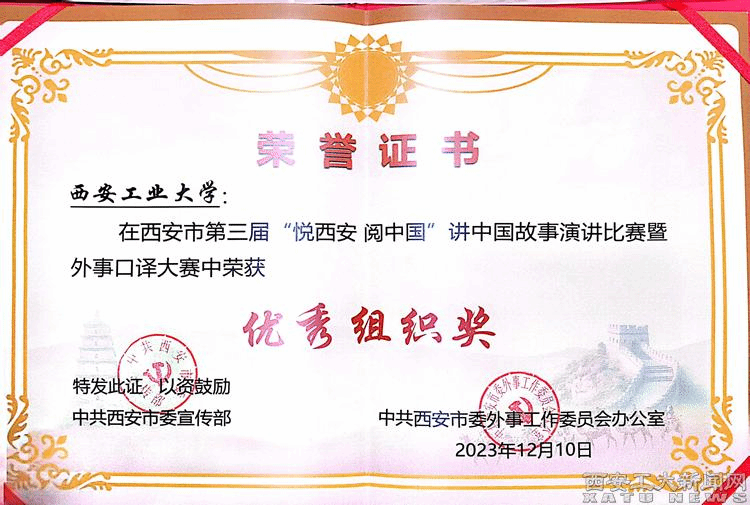 (本网讯)12月10日,“悦西安 阅中国”西安市第三届讲中国故事演讲比赛暨外事口译大赛决赛在西安外国语大学(长安校区)举行,我校国际教育学院留学生马泽和沈耀分获汉语组二等奖和优秀奖。万象城平台,万象城(中国)一站式服务平台获得本届大赛优秀组织单位奖,翟佳、任媛媛获优秀指导教师称号。