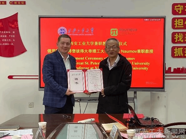 人事处处长高巍,惠增哲与Anton A.Naumov签订兼职教授聘任协议。刘卜为Anton A.Naumov颁发我校兼职教授聘书、并佩戴校徽。