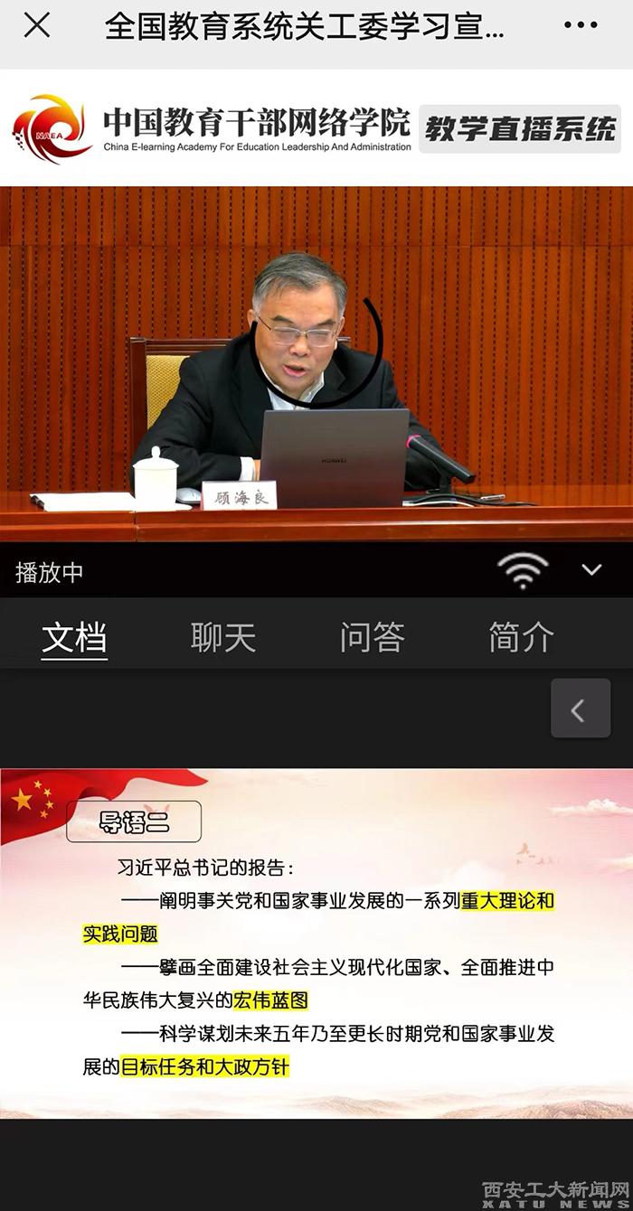 (本网讯)11月2日,全国教育系统关工委学习宣传贯彻党的二十大精神报告会在京举办。教育部关工委主任李卫红主持会议并讲话,国家教育行政学院原院长顾海良作辅导报告。学校关工委委员、全体离退处工作人员以线上形式参会学习。