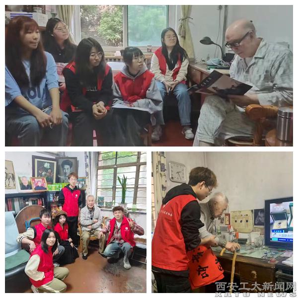 一大清早,志愿者们携带自己创作的书画作品,走进老干部、老专家、老教师家中,与老同志热情交流,分享学校建设发展情况和青年时代的奋斗历程。在融洽的氛围中,王伟东老同志勉励青年志愿者们,要坚定不移跟党走,身为新时代青年的你们,要握好手中的接力棒,传承好党的优良传统和“兵工精神”;白全章老同志讲述了学校早年的发展历程,结合自身的学习工作经历分享了“西工故事”。老同志的故事感人至深,“五老”的典型示范和他们身上的奉献奋斗精神使青年们收获颇丰。