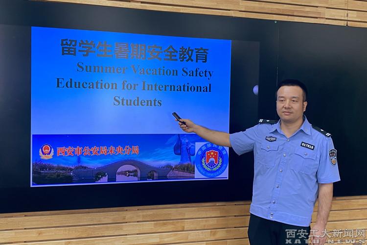 (本网讯)为持续做好暑期来华留学生安全教育管理和服务工作,进一步增强我校来华留学生法律意识,预防各类安全事故和违法事件的发生,7月11日下午,国际教育学院组织召开了2024年来华留学生暑期安全教育大会,并邀请西安市公安局未央出入境管理科付强警官作政策解读。