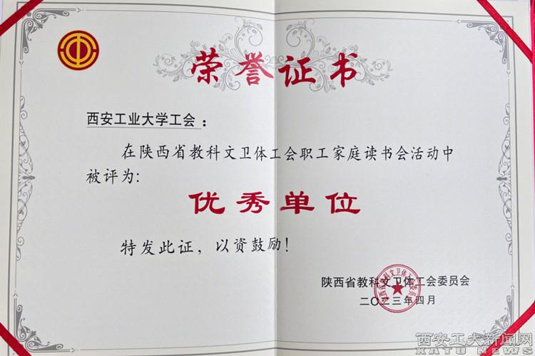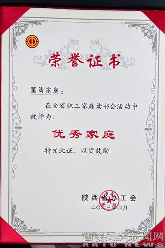 (本网讯)由陕西省总工会主办,陕西省教科文卫体工会承办的全省“职工家庭读书会”活动,我校工会荣获优秀单位奖,光电学院董涛荣获优秀家庭奖。