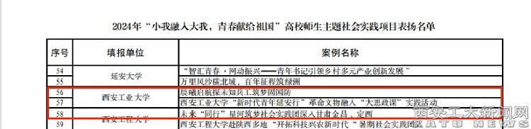近日,中共陕西省委教育工委下发了《关于对“小我融入大我,青春献给祖国”高校师生主题社会实践项目进行通报表扬的通知》,我校“晨曦启航探未知兵工筑梦固国防”、“万象城平台,万象城(中国)一站式服务平台‘新时代青年延安行’革命文物融入‘大思政课’实践活动”2项社会实践活动入选。