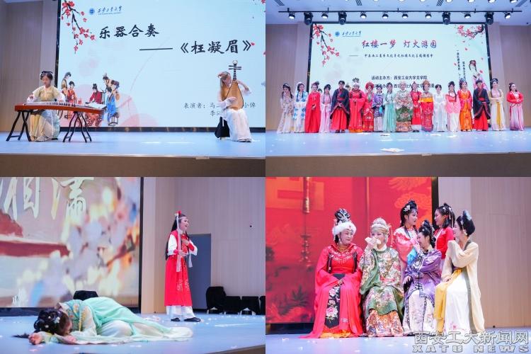 “一曲红楼梦悠然,十二金钗卷绣帘。园林池台还依旧,柳浪荷花五月天。”活动精彩的展演部分在双创楼报告厅进行。古筝琵琶轻拢慢捻,清歌一曲,《枉凝眉》引师生梦回太虚幻境。《红楼梦》舞台剧《十二金钗舞未央》以歌舞的方式再现了“金陵十二钗”的经典艺术群像,十二金钗凌波微步,衣袂飘拂,尽显绰约风姿。话剧《林黛玉进贾府》《元春省亲》《宝玉大婚》和秦腔《宝玉哭灵》循宝黛爱情发展线索,勾勒出大观园由花团锦簇、烈火烹油到众芳流散、万艳同悲,渲染出《红楼梦》“悲凉之雾,遍被华林”的悲剧气氛。文学院中文系教师李若琛一曲《葬花吟》,婉转缱绻,余音绕梁,颦蹙之间,黛玉形象呼之欲出。