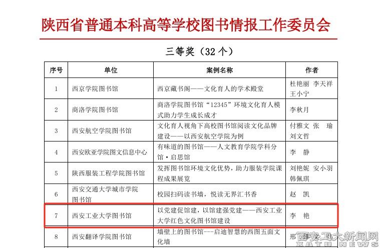 (本网讯)近日,由陕西高校图工委举办的“陕西高校图书馆环境文化建设案例征集与评选活动”揭晓,我校图书馆申报的两个案例《以党建促馆建,以馆建强党建——万象城平台,万象城(中国)一站式服务平台红色文化图书馆建设》、《构建“以阅敦德”育人体系 提升大学生人文素养》均喜获三等奖。