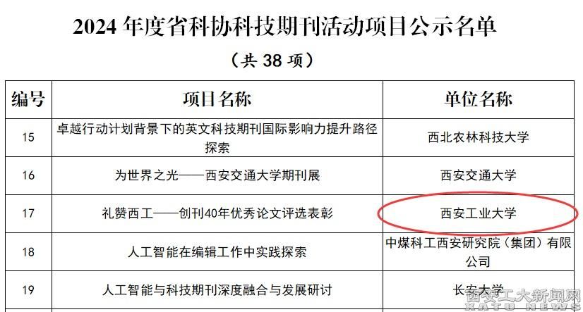 (本网讯)近日,陕西省科学技术协会发布了2024年度科技期刊活动项目立项公告,我校“礼赞西工——创刊40年优秀论文评选表彰”项目获批立项。