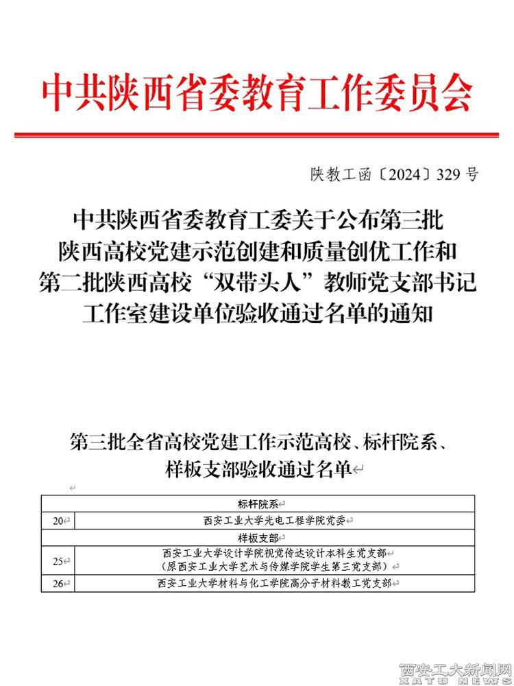 (本网讯)近日,省委教育工委公布了第三批陕西高校党建示范创建和质量创优工作验收结果,我校光电工程学院党委、材料与化工学院高分子材料教工党支部、设计学院视觉传达设计本科生党支部顺利通过验收。