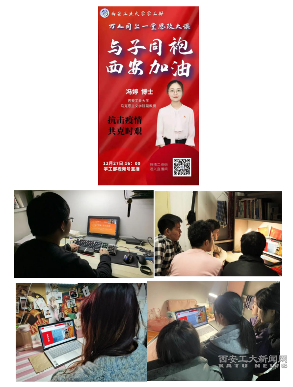 马克思主义学院教师冯婷,在线为全体西工学子共上《与子同袍 西安加油》思政课。从“家是最小国”,“国是千万家”,深入讲解家国情怀的时代内涵,要求同学们担起新时代赋予的历史责任,在当前疫情防控的紧急时刻,不负使命、砥砺前行,用奋斗者最美的姿态,去冲刺人生的百米赛,书写无愧于时代的壮丽篇章。