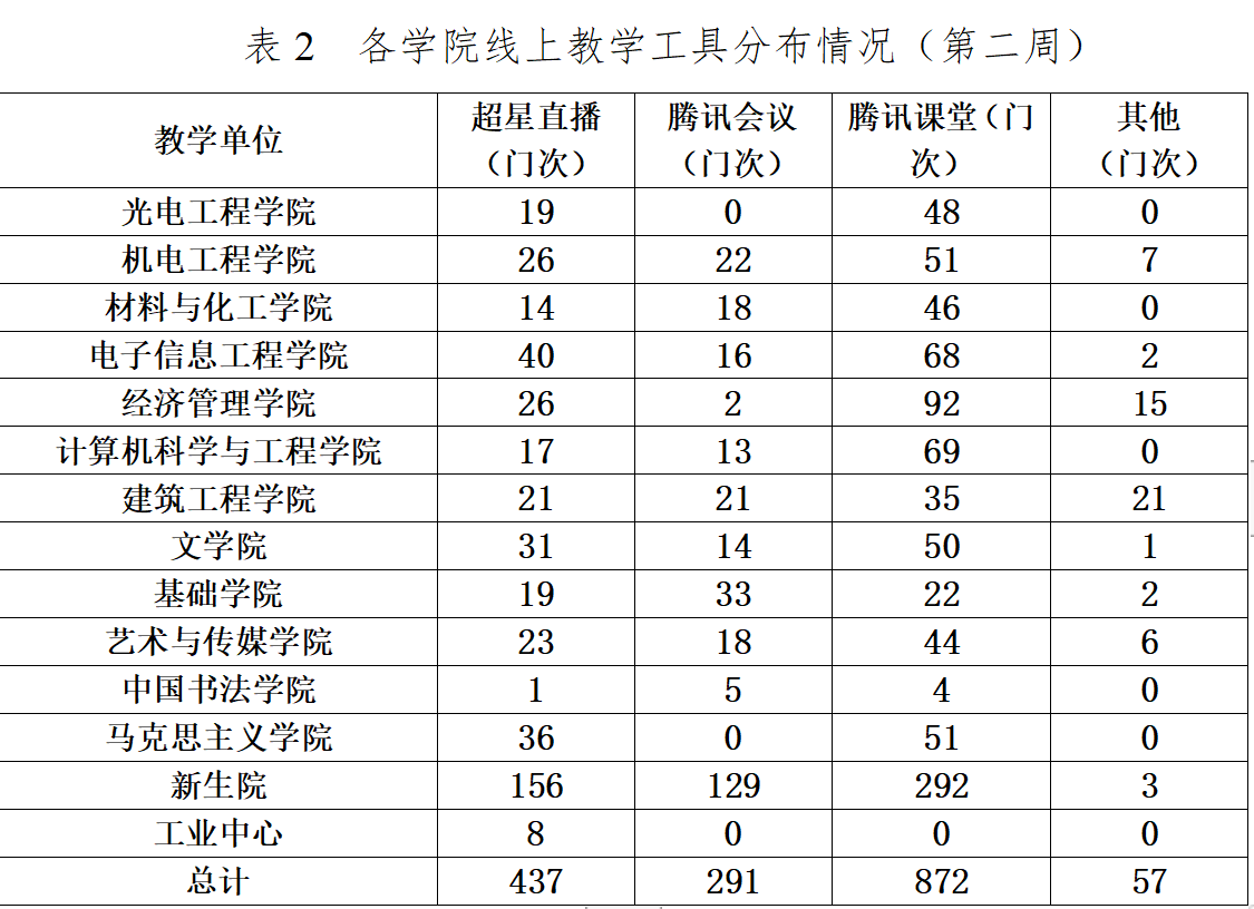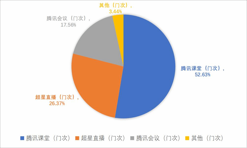 通过前期的问题反馈,教师对线上教学工具进行了优化,从本周教师线上直播教学工具的使用情况来看,腾讯课堂和超星直播有所增加,腾讯会议有所减少,具体情况如下: