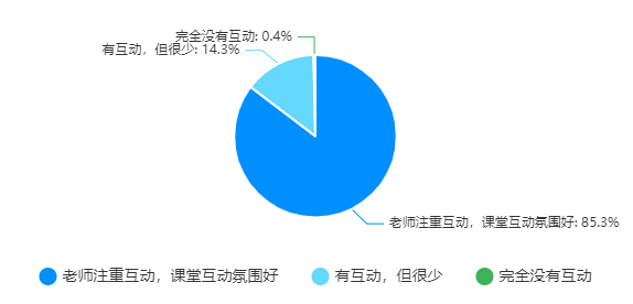 通过对学生调查反馈来看,学生对教师线上教学中师生互动认可度较高,认为老师注重互动、课堂互动氛围好,占比85.3%;有互动、但很少,占比14.3%;完全没有互动,占比0.4%。
