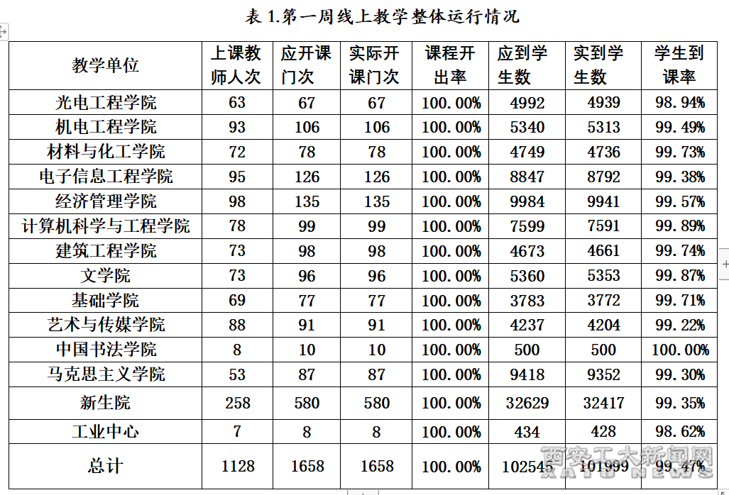 第一周的线上教学稳步推进,上课教师729人,应开课1658门次,实际开课1658门次,课程开出率100.00%,应上课学生数102545人次,实到学生数101999人次,学生到课率99.47%。在全校师生共同的努力下,我校第一周线上教学工作整体平稳有序,教师注重教学质量,总体情况良好。