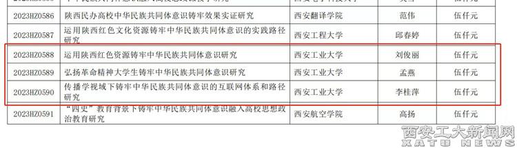 之前,根据陕西省社会科学界联合会《关于公布陕西省铸牢中华民族共同体意识专项课题立项结果的通知》,我校马克思主义学院刘俊丽副教授的《运用红色资源铸牢中华民族共同体意识研究》、孟燕副教授的《弘扬革命精神大学生铸牢中华民族共同体意识研究》和计算机学院李桂萍副教授的《传播学视域下铸牢中华民族共同体意识的互联网体系和路径研究》等3项课题成功立项。