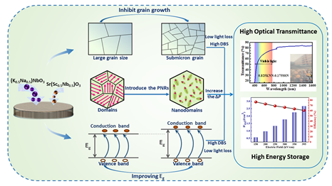 (本网讯)能够存储和释放电荷的铁电材料因其具有超快的充放电速度及高的功率密度,可作为储能元件,在电力电子转换器、新能源汽车及脉冲功率系统中发挥关键作用。其中,透明铁电陶瓷由于能把光、电、力等性能耦合在一起,已成为光纤通信、集成光学和信息处理等领域应用的核心元件之一。随着各国对含铅材料的限制,开发可替代含铅材料的无铅透明铁电陶瓷迫在眉睫。但无铅陶瓷的高击穿场强、大极化强度及高光学透过率往往难以兼具,导致大多数无铅陶瓷的储能密度小、储能效率低或透明性差,限制了电子元器件面向高性能及多功能化的发展要求。如何保证在拥有高的储能密度的同时使光学透过率得到进一步提升,是获得高储能性能无铅透明铁电陶瓷研究的难点之一。