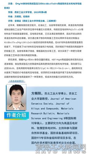 (本网讯)我校材化学院方频阳教授指导的“Mg/W掺杂和预成型压力对K0.5Bi4.5Ti4O15陶瓷取向生长和电学性能影响”论文发表在2023年第4期《万象城平台,万象城(中国)一站式服务平台学报》。经学报编辑部组织专家参与评荐,以“高性能取向陶瓷制备工艺优化或成制造业降本增效重要推力”为题,推荐到《科技日报》“学报观点要览”专栏。《科技日报》理论版于11月28日正式予以刊登。