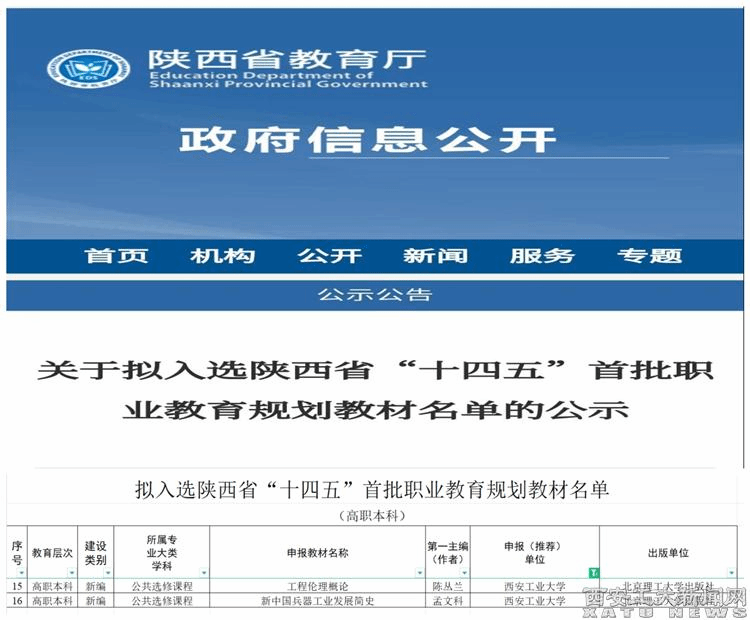 (本网讯)近日,陕西省教育厅公布了陕西省“十四五”首批职业教育规划教材的立项结果,我校2本教材获批立项。两本教材分别是马克思主义学院“中国式现代化暨强军伦理高水平学科团队”陈丛兰教授负责的《工程伦理概论》和孟文科副教授负责的《新中国兵器工业发展简史》。