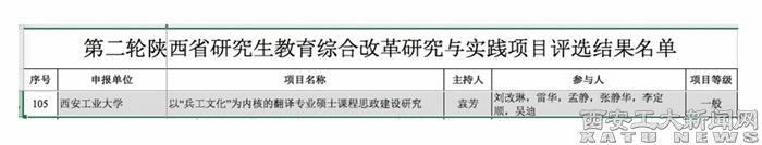 (本网讯)近日,陕西省教育厅研究生处公布了《2023年度陕西省研究生综合改革研究与实践项目》立项名单,我校文学院袁芳老师的《以“兵工文化”为内核的翻译专业硕士课程思政建设研究》成功获批一般项目。