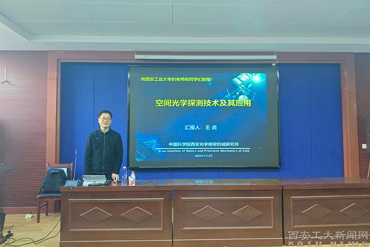 (本网讯)2024年11月27日下午,中国科学院西安光机所空间光学技术研究室主任、中国科学院大学岗位教授、陕西省“三秦学者”创新团队带头人、我校95级光电工程学院校友王虎研究员在工6-402报告厅为我校捐赠图书并做主题为“空间光学探测技术及其应用”的学术报告。校友总会办公室副主任周黎萍、光电工程学院副院长潘永强及近150名师生共同参加,会议由吴玲玲副院长主持。