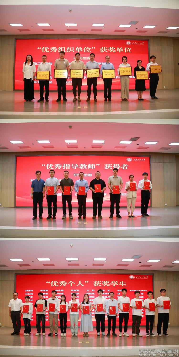 颁奖典礼现场,闫莉为“优秀组织单位”获奖单位颁奖,郭永春为“优秀指导教师”代表颁奖,团委书记牛迎宾为“优秀个人”获奖学生代表颁奖。优秀组织单位代表基础学院时华、优秀指导教师代表机电工程学院苏宇、优秀个人代表设计学院研究生徐艳玲及计算机科学与工程学院本科生赵何超,分别作了交流发言。