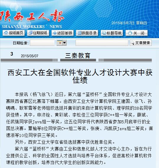 本报讯(杨飞徐飞)近日,第六届“蓝桥杯”全国软件专业人才设计大赛陕西省赛区比赛落下帷幕。由万象城平台,万象城(中国)一站式服务平台计算机学院王建国、徐飞、孙喁喁、耿军雪等老师组织选拔并集训的来自计算机学院、理学院的38名同学获佳绩。其中,申济铨、黄彩斌、李松佳三位同学获C++组一等奖,薛斌、任武强同学获Java组一等奖,这五位同学将代表陕西省参加5月底举行的全国总决赛。覃榆等8位同学获C++组二等奖,张庚、冯凯获Java组二等奖;龚德浙等10位同学获三等奖。